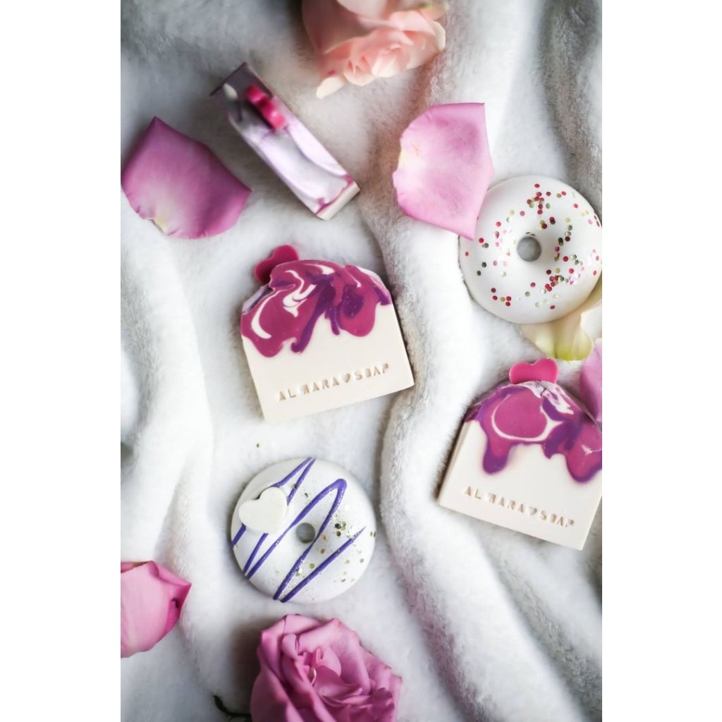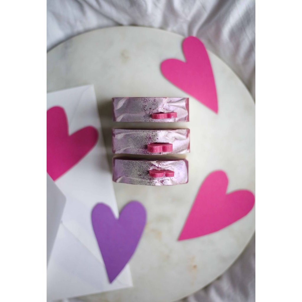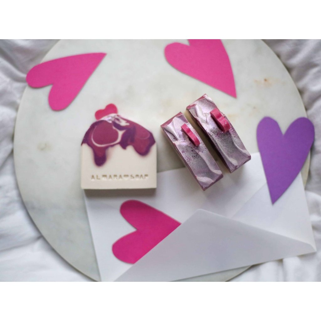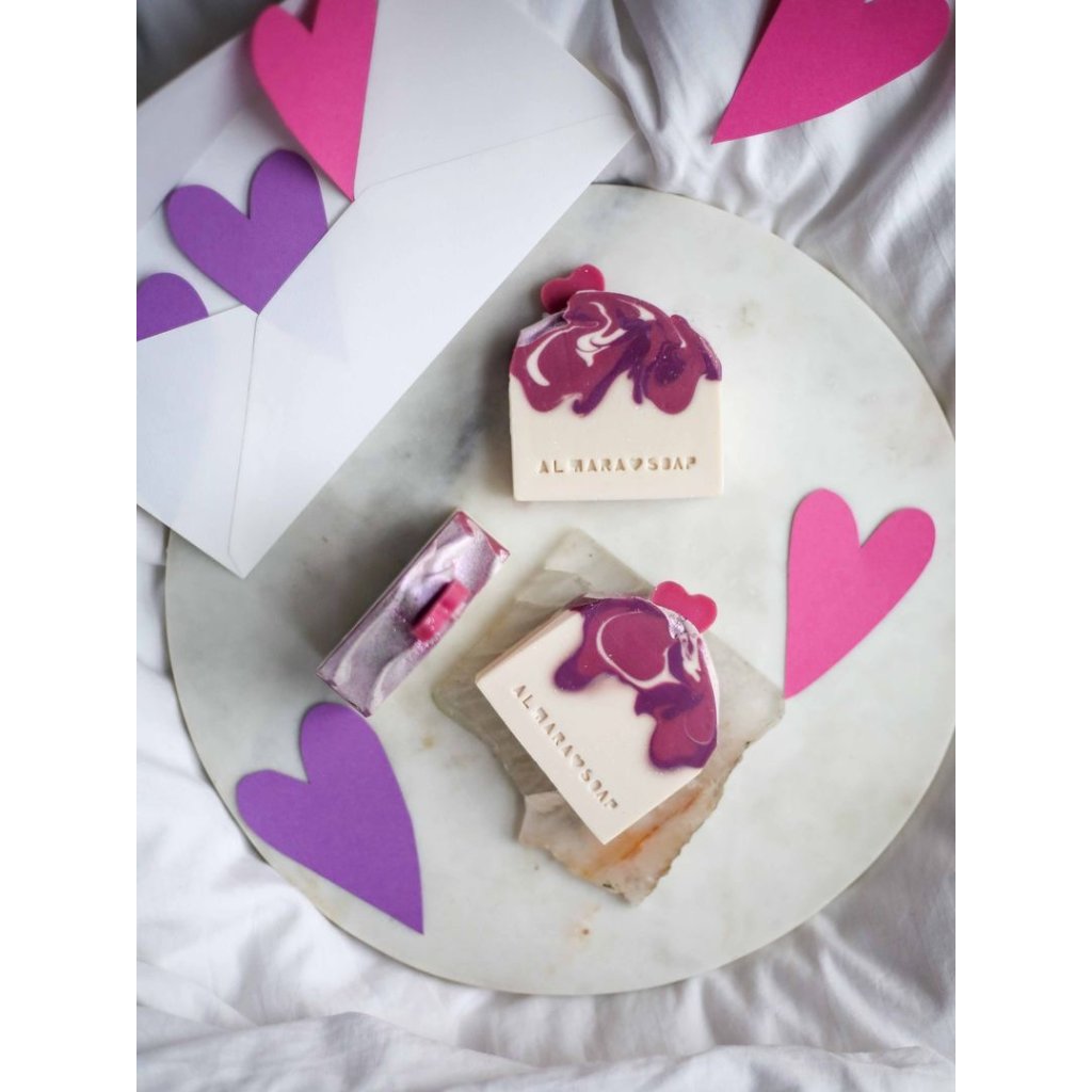 Bílý základ zdobený fialovo-růžovým mramorováním, jemným shimmerem a malým srdíčkem z něj dělají něžně hravý a estetický kousek — ideální jako drobný dárek z lásky.