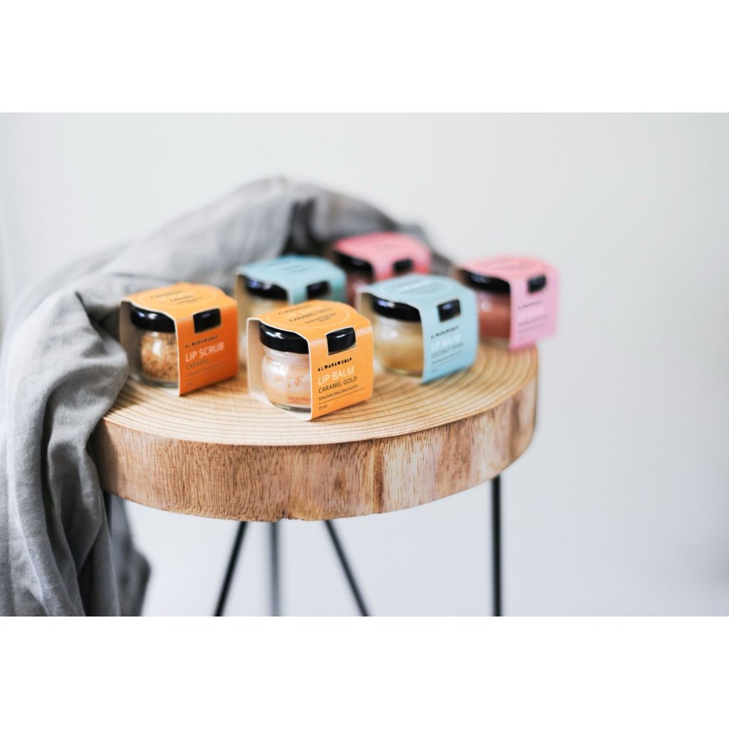 Obsahuje bio třtinový cukr, mandlový olej lisovaný za studena, bio bambucké máslo a přírodní žvýkačkové aroma. Krásně růžovou barvu mu dodává brusinkový prášek. Obsažené cenné oleje, másla a cukr vyčarují sametově jemné a šťavnaté rty.