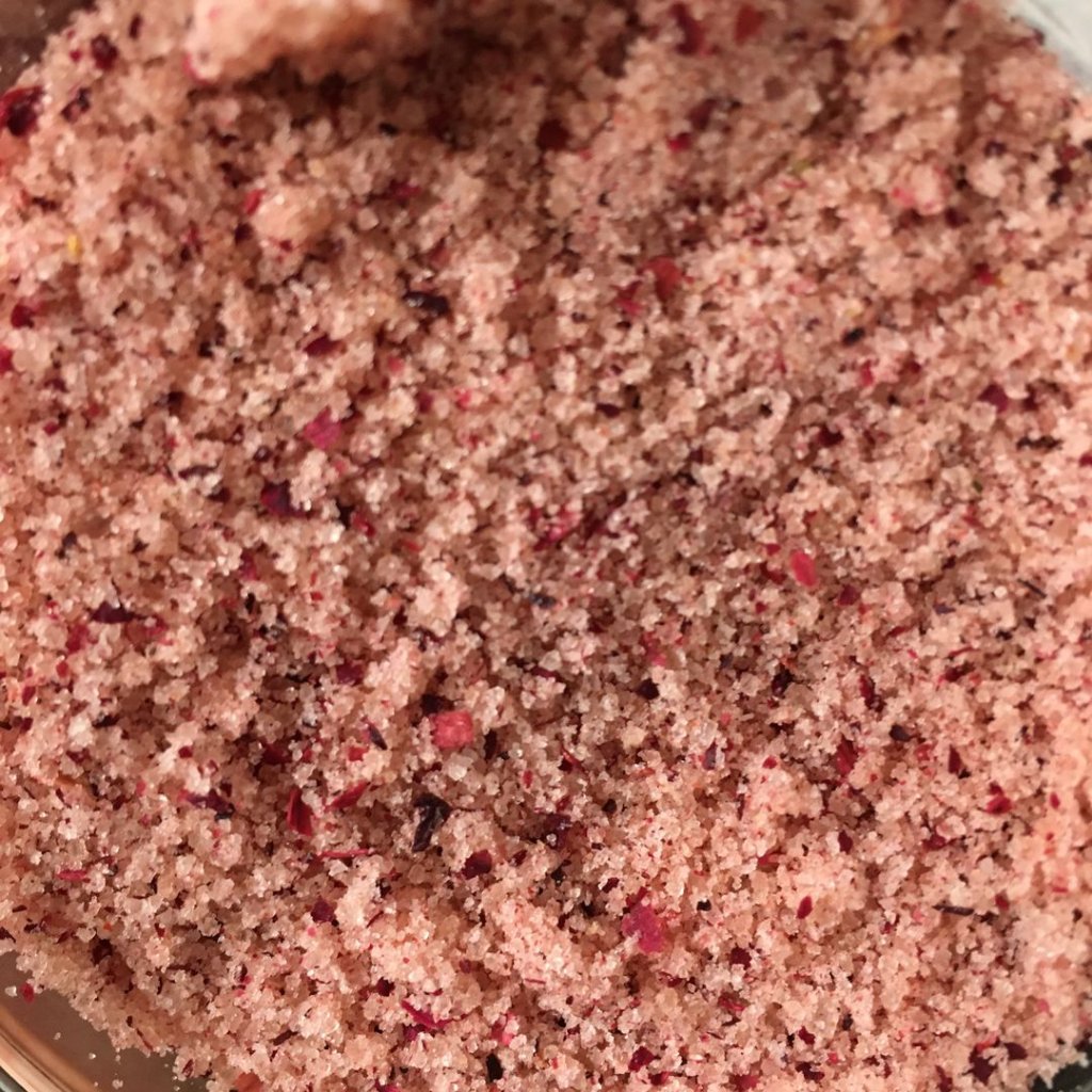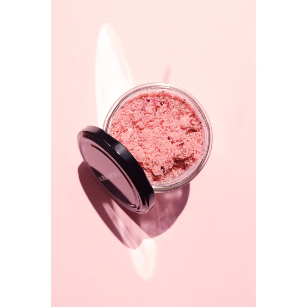 bio světlý třtinový cukr, jemně mletá mořská sůl, slunečnicový olej, ricinový olej LZS, růžový jíl, jahodový prášek, květy růže, parfém (kompozice vonných olejů)