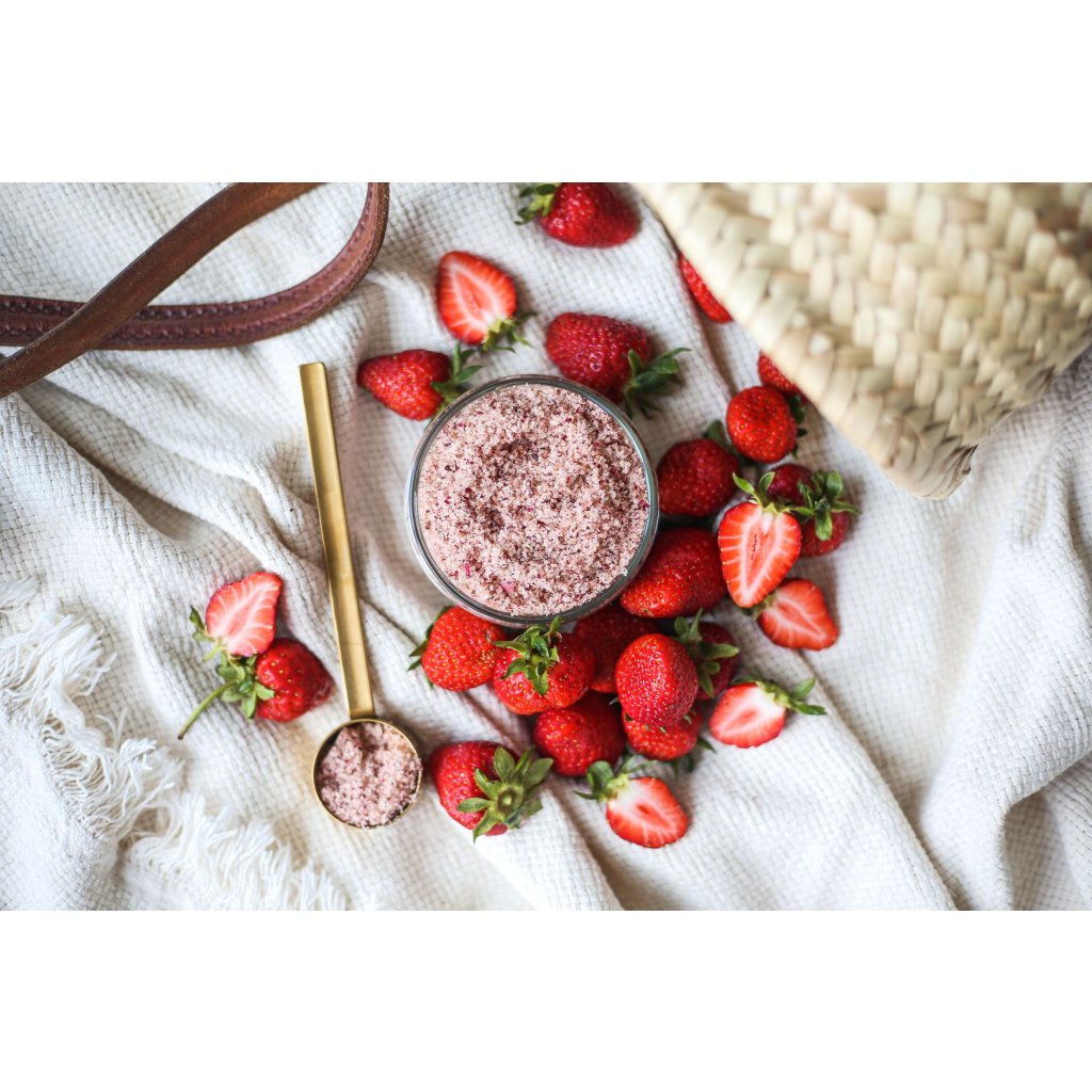 Strawberry Cream je založen na bio třtinovém cukru a jemně mleté mořské soli, které zajišťují šetrnou a efektivní exfoliaci. Je obohacen o za studena lisované rostlinné oleje, konkrétně slunečnicový a ricinový, které umožňují snadnou aplikaci a současně pokožku hloubkově vyživují.