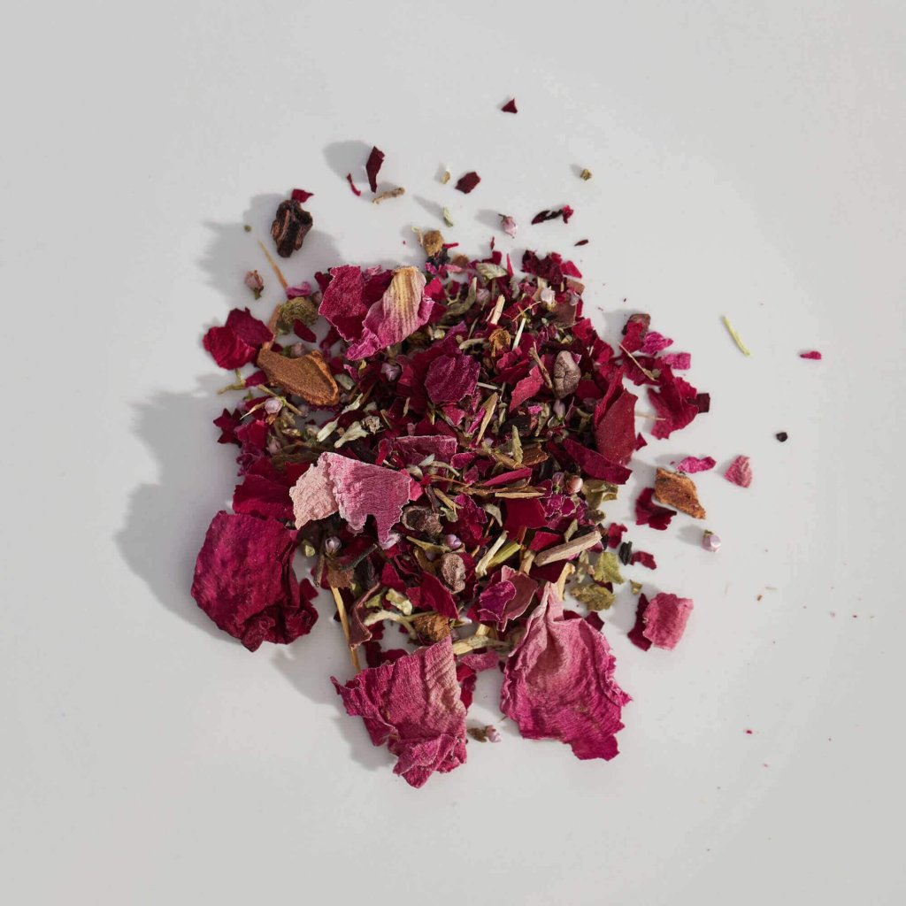 Kompletní složení: Růže šípková – květ, Ibišek – květ, Pivoňka – květ, Kakaové boby drcené, Damiána – nať, Kotvičník – nať, Muira Puama – dřevo, Vřes – květ, Skořice – kůra, Eleuterokok (Sibiřský ženšen) – kořen, Catuaba – kůra