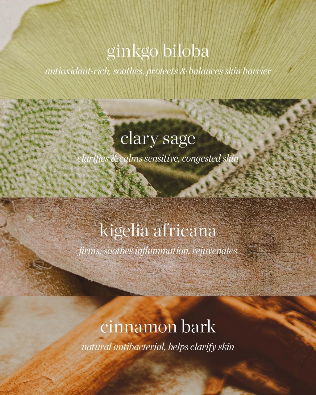 glucose, sodium benzoate, sodium dehydroacetate, sodium methyl oleoyl taurate, citric acid, sodium cocoyl isethionate, sodium chloride, coconut acid, glycerin, aqua (water), kigelia africana fruit extract, ginkgo biloba leaf extract, salvia sclarea (clary) extract, cinnamomum zeylanicum (cinnamon) bark extract, sodium isethionate