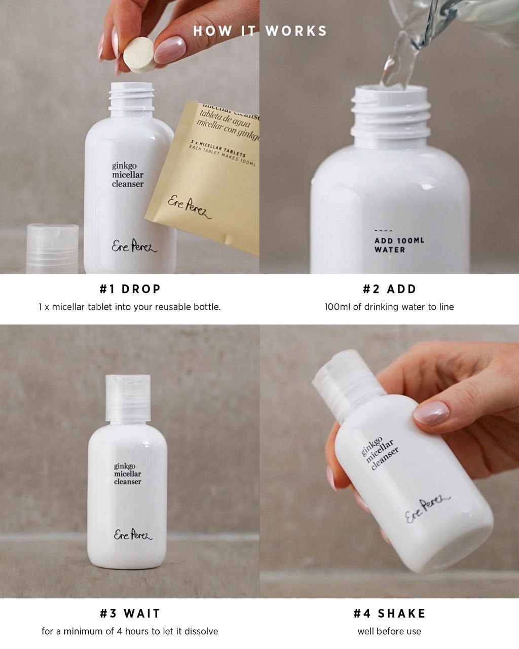 Revoluční vodou aktivovaná micelární voda – jemná k pleti, výkonná v účinku, pokročilá svým designem. Nyní v inovativní formě koncentrovaných tablet, které se snadno rozpustí ve znovupoužitelné lahvičce.