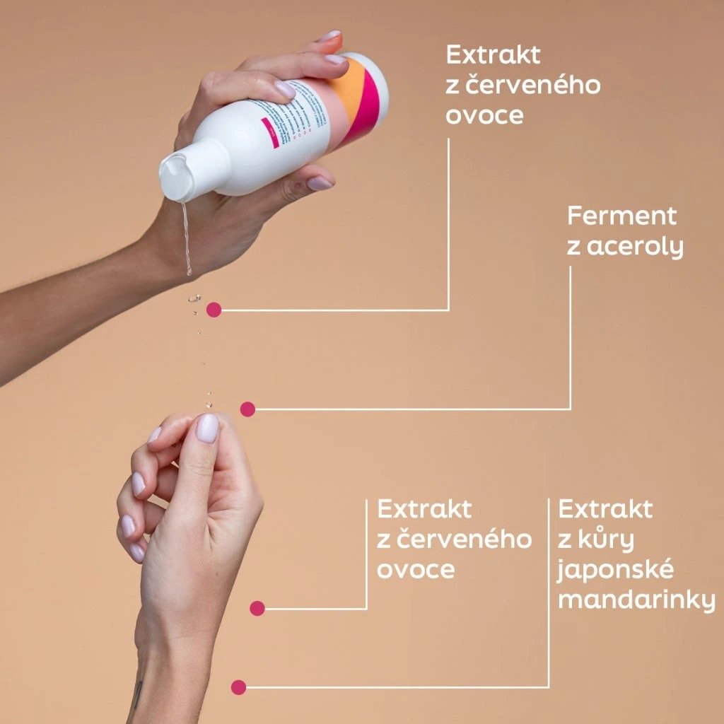 AQUA (voda), GLYCERIN (rostlinný glycerin), PENTYLENE GLYCOL (hydratační složka), LACTOBACILLUS ACEROLA/CHERRY FERMENT (ferment z aceroly), GLYCOLIPIDS (jemný přírodní tenzid), ALOE BARBADENSIS LEAF JUICE (šťáva z aloe vera), PROPANEDIOL (hydratační složka), RUBUS IDEUS FRUIT EXTRACT (extrakt z malin), FRAGARIA ANANASSA FRUIT EXTRACT (extrakt z jahod), RUBUS FRUTICOSUS FRUIT EXTRACT (extrakt z ostružin), DISODIUM COCOYL GLUTAMATE (jemný přírodní tenzid), CITRUS UNSHIU PEEL EXTRACT (extrakt z kůry japonské mandarinky), LEUCONOSTOC/RADISH ROOT FERMENT FILTRATE (probiotická konzervační látka), BENZYL ALCOHOL (konzervant pro přírodní kosmetiku), DEHYDROACETIC ACID (konzervant pro přírodní kosmetiku), SODIUM BENZOATE (konzervant pro přírodní kosmetiku), POTASSIUM SORBATE (konzervant pro přírodní kosmetiku), SODIUM PHYTATE (chelatační látka, váže ionty kovů), PARFUM (přírodní parfém), CITRIC ACID (regulátor kyselosti).
