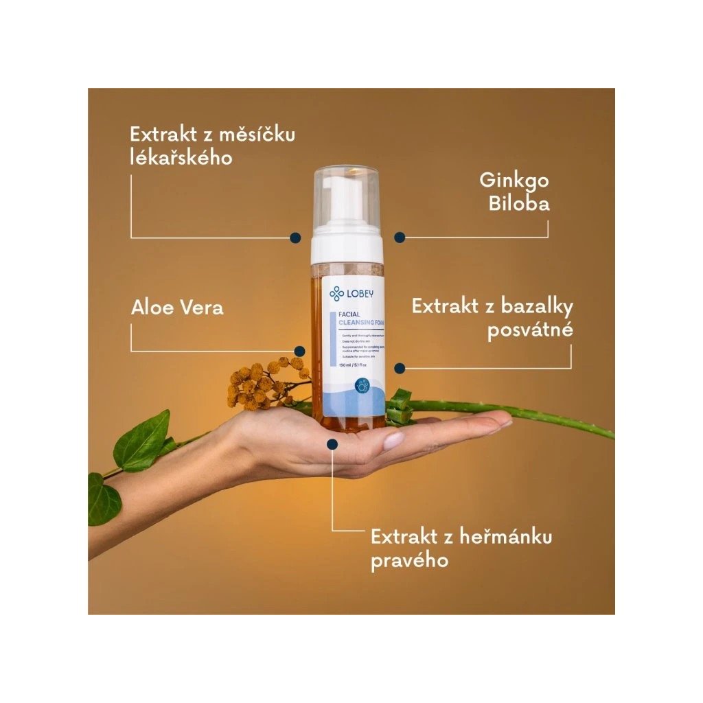 Obličejová mycí pěna určená pro jemné omytí pokožky obličeje. Je velmi šetrná, určená pro každodenní použití. Pěnu snadno nanesete na obličej a bez námahy odstraníte nečistoty, které se na pleti usazují během celého dne. Obsahuje jemné mycí látky na bázi kokosového oleje, přírodního extraktu z Heřmánku lékařského, aloe vera, měsíčku lékařského, tulsi a ginko, jež mají blahodárné a regenerační účinky.