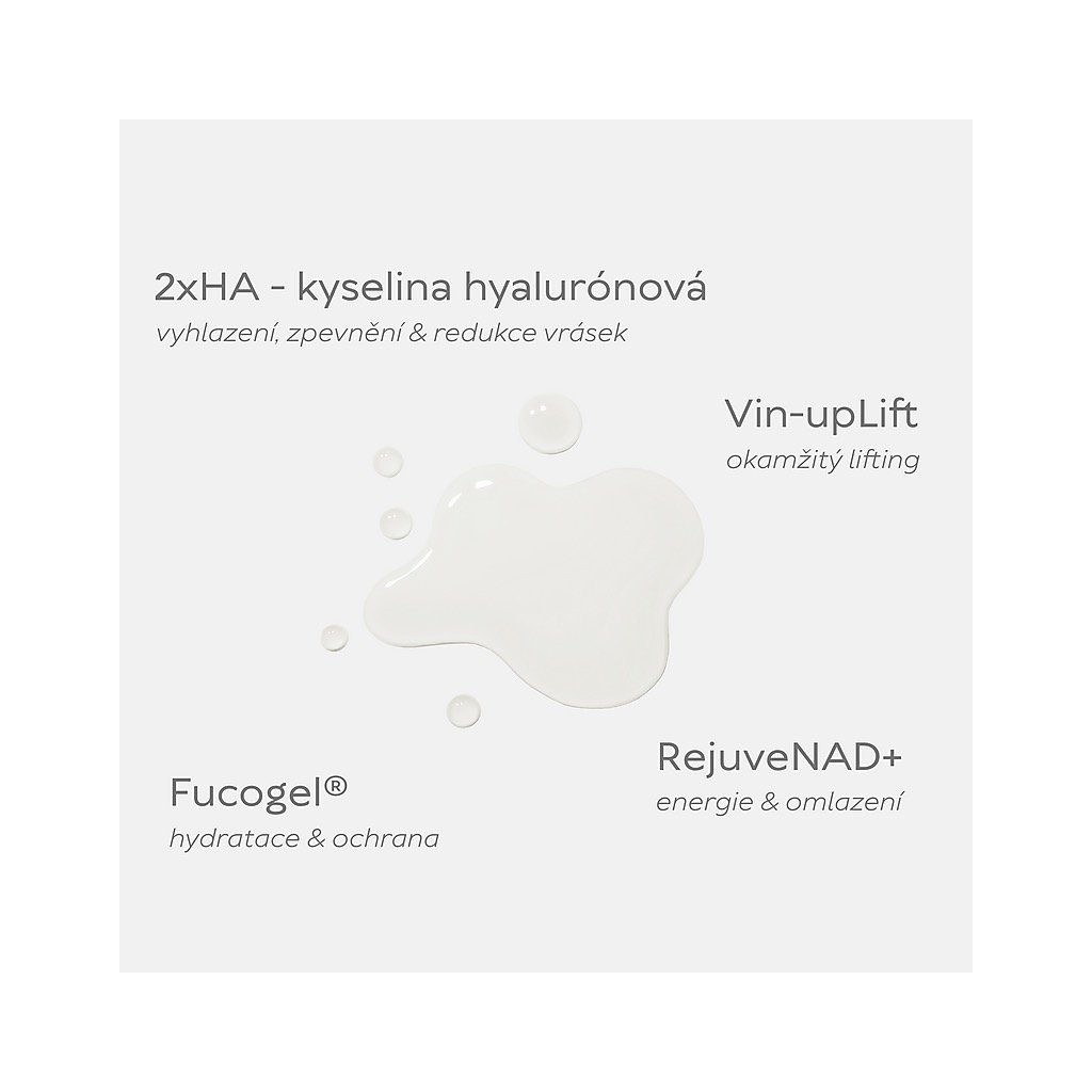 Skládá se: BIO Růžová vodaRosa Damascena Flower WaterBIO Fucogel®Biosaccharide gum-1 Pentylen Glycol ECO Green+Pentylen Glycol Gosulin ILIsoamyl Laurate, Isoamyl Cocoate RejuveNAD™Helianthus Annuus (Sunflower) Sprout Extract (and) Maltodextrin (and) Aqua / Water Kyselina hyaluronováHyaluronic Acid Extrakt z řasy AlteromonasWater (and) Alteromonas Ferment Extract Vin-upLiftWine (and) Caesalpinia Spinosa Gum (and) Maltodextrin (and) Aqua / Water HyActive ™ veľmi nízka molekulární hmotnostSodium Hyaluronate Iscaguard®PFAPhenethyl alcohol, Caprylyl glycol.
