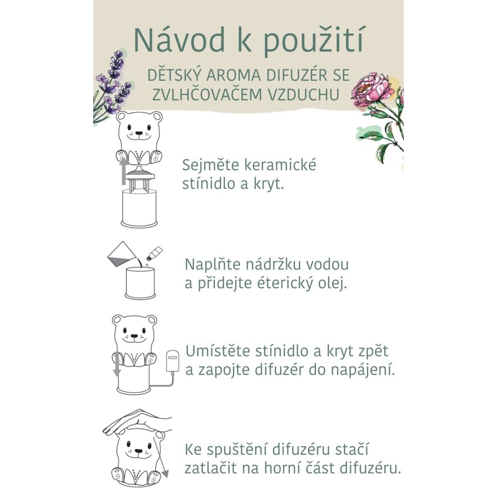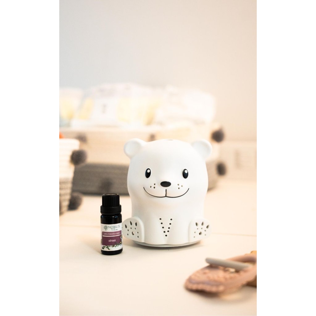 Útulnou atmosféru v dětském pokoji vykouzlí aroma difuzér v hravém designu medvídka. Díky ultrazvukové technologii šetrně rozptyluje vonnou mlhu po místnosti, a představuje tak perfektního pomocníka pro zvlhčení vzduchu, pročištění a bezpečné provonění prostoru éterickými oleji. Jejich účinky tak děti mohou přirozeně vdechovat a společně je oceníte i v období potíží, například při nachlazení, pro zklidnění před spaním nebo pro podporu koncentrace při učení. Tichý chod difuzéru neruší a barevné LED podsvícení funguje jako lampička s možností prolínání 7 druhů barev. Dětem rozzáří oči přiložený dárek (dětský náramek).